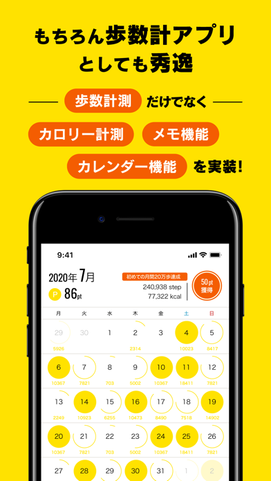 もちろん歩数計アプリとしても秀逸。歩数だけでなく、カロリー計測、メモ機能、カレンダー機能を実装!