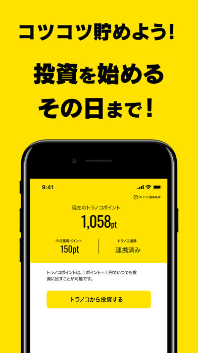 *ウォーキングでたまる投資資金は、トラノコ内で1ポイント=1円で投資に使えるトラノコポイントの形でたまっていきます。