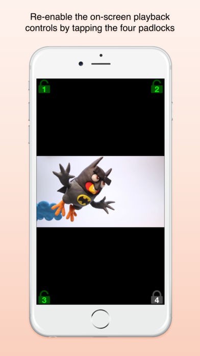 App Storeより引用Screen Lock adds the possibility to disable the on-screen playback controls when your kid watches video on the built in YouTube-player. Tap once on the padlock button in upper right corner of the player to disable the on-screen playback controls. A numbered padlock in each corner will appear when the on-screen playback controls are disabled. You re-enable the on-screen playback controls by tapping the four padlock buttons in each corner in sequence.