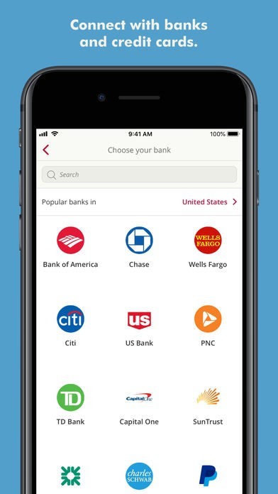 - automatically connect over 12 000 different bank accounts, credit cards or financial services in the United States and around the world. Available connection include; Chase, Bank of America (BofA), Capital One, Charles Schwab (SCHW), Citi, HSBCnet, PNC, SunTrust, TD Bank, US Bank, Wells Fargo, PayPal, Wealthfront, Betterment, Coinbase, Bitstamp and others.