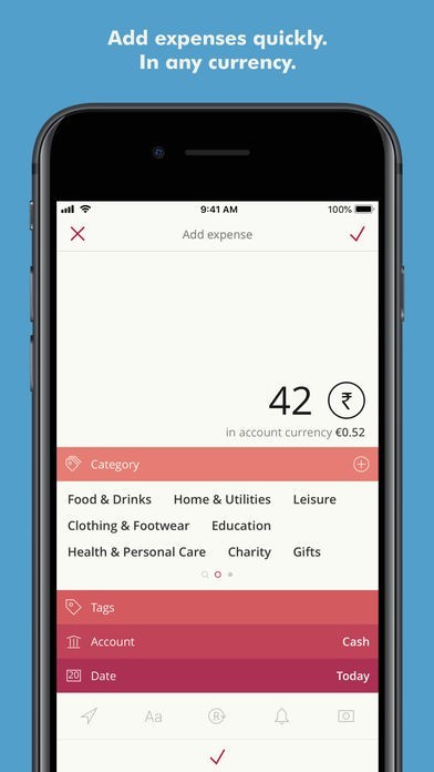 - quick & easy manual expense entry in only 4 taps. Tip calculator included.