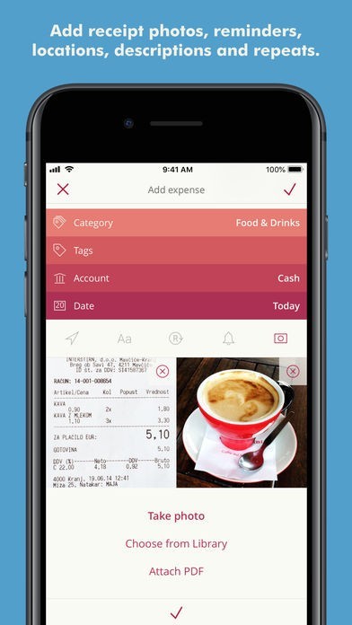 - add rich data to entries: multiple tags, financial account, location, description, repeats, bill reminders with notifications, photos. Photos are great for keeping receipts, warranty info and expense reporting.
