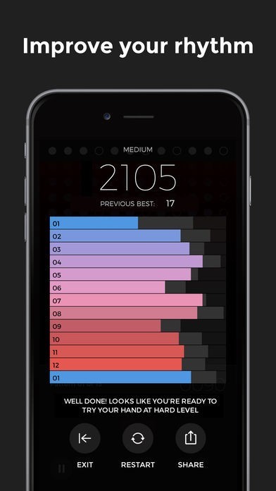App Storeより引用The game that improves your rhythm by challenging you to play Steve Reich’s groundbreaking work Clapping Music – a piece of music performed entirely by clapping. Tap in time with the constantly shifting pattern, and progress through all of the variations. If you slip up or your accuracy falls too low, it’s game over.