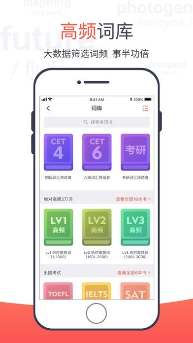 拓词所有单词书的中、英文释义和真人发音均由《柯林斯高阶英汉双解学习词典》官方授权使用,内容专业权威、无可挑剔。词库囊括了新概念、中考、高考、四级、六级、专四、专八、考研、在职硕士、托福、雅思、SAT、GRE、GMAT、成人英语、专升本、自考英语、高级口译等考试内容,还加入了人教版、外研社版和北师大版小学、初中、高中学校教材同步单词书。词库体系覆盖所有年龄层,从零基础的小学生到冲刺GRE的成年人,每个人都能在拓词找到最适合自己的学习计划。