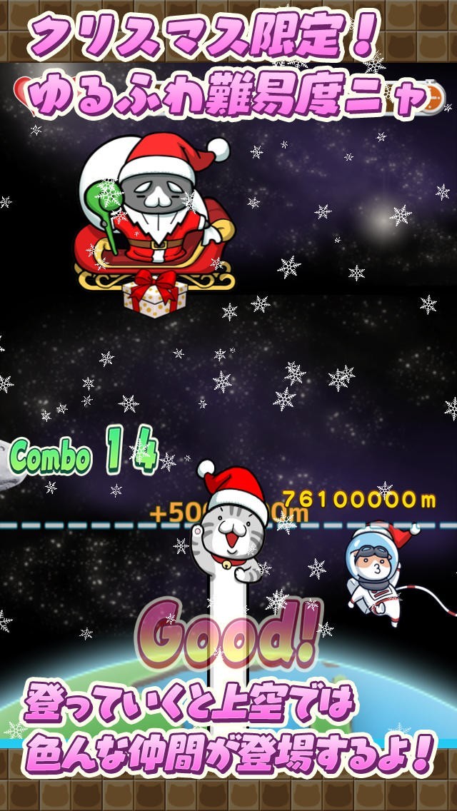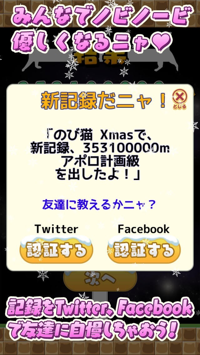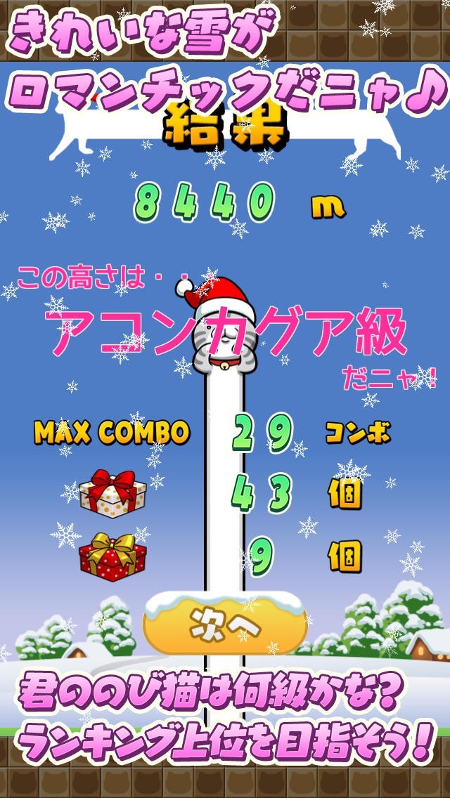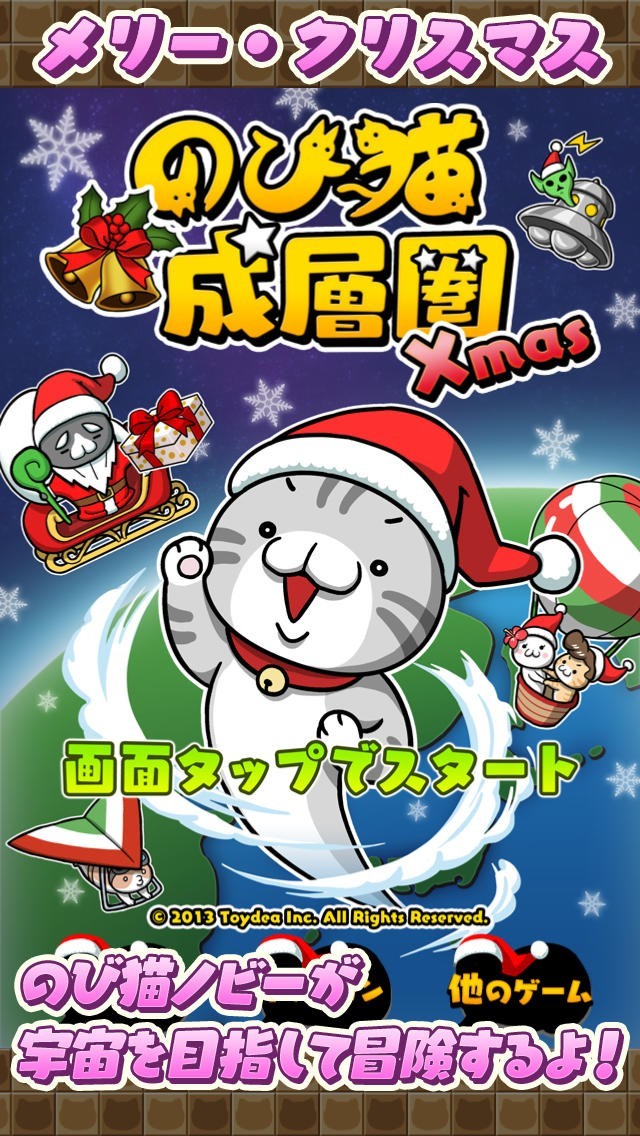 「のび猫 Xmas」は猫がプレゼントを投げてくるのをキャッチするゲームになります。 操作は実に簡単であり、画面を投げてくるプレゼントに合わせてタイミングよくタップするだけでよいのです。 アクションゲームであり、それでも複雑な操作は必要ないので誰でも気軽に楽しむことができます。 可愛い猫との触れ合いを堪能することができるゲームとなっています。 FacebookやTwitterと連動しているのでそのまま記録を投稿も可能になっています。