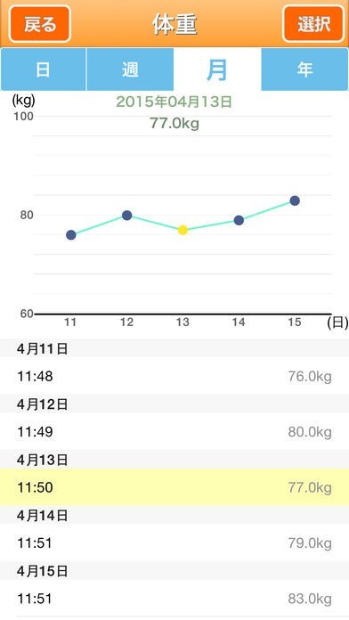 ・カルテ:測定した結果を時系列のグラフと表で保存して、確認する事ができます。