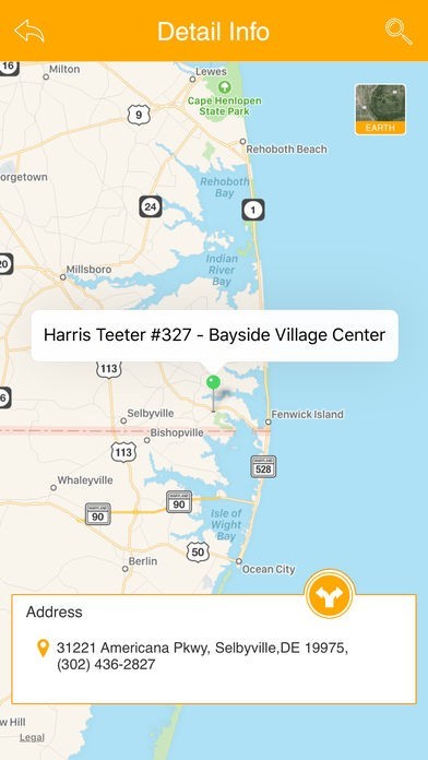 Harris Teeterの名前や現在地から店舗を検索することができ、選んだ店舗の地図や住所、電話番号や行き方が表示されます。全米の約230店舗全ての情報を見ることができます。