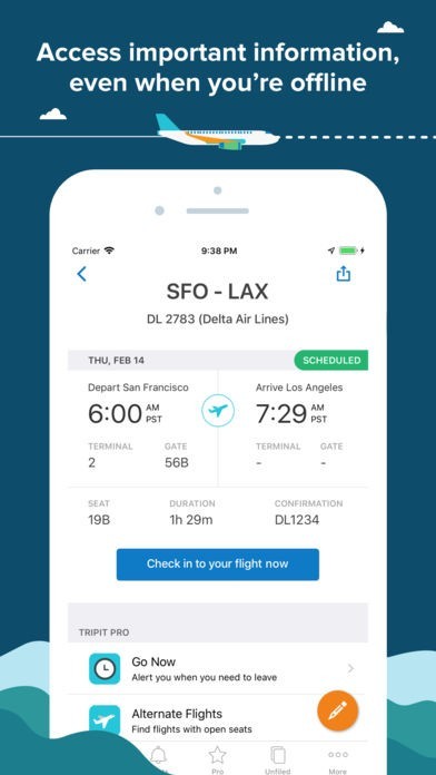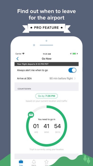 TripIt Proにアップグレードすると、充実した機能が解放されます。飛行機でより良い席を見つけられたり、フライト時刻をアラームで教えてくれたりするのでとても便利です。