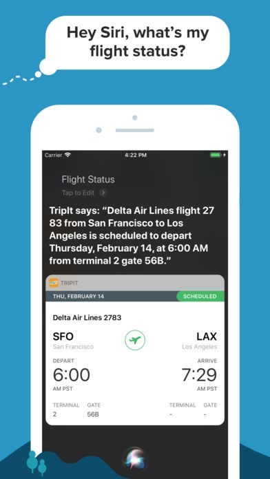 もう飛行機に搭乗する時や、ホテルにチェックインするときに重要な情報を探し回る必要はありません。予約番号などは 「TripIt」の中に全て入っています。さらにiOS 12のSiriのショートカットを使うことで、ハンズフリーで情報を引き出すことが可能です。