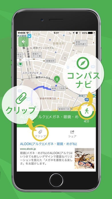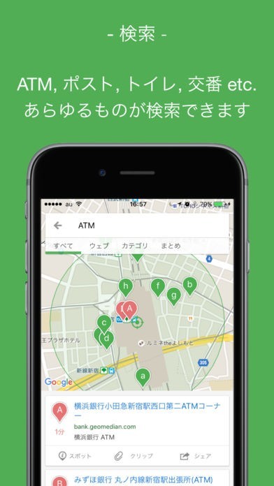 気になるポイントを代表として、これ以外にも近辺にある施設も同時に探してくれる、魅力的なマップアプリです。