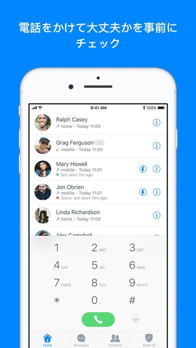 「Truecaller」では2億5千万人の方々が協力して、迷惑な電話番号などを登録してくれているので、知らない番号から電話がかかってきた瞬間に場合によっては「迷惑電話」と表示されスクリーンが赤くなります。 そのようなものは無視すればいいですが念のため多少はコミュニケーションをとりたいという場合にはメッセージを送信するというようなことも出来ます。 このような迷惑と判断される情報は会社の営業などが多いのですが、個人でストーカーされているような場合には「マイブロックリスト」に登録しておけば安心できます。 加えて、不審に思ったものがあれば検索によって調べておくということもできます。 他には友人の状態を目で見て確認できるので、忙しそうなら後で電話をかけるなどといった判断に使うことができ、円滑に交流できます。