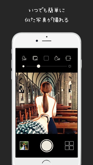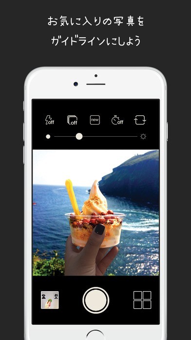 30のガイドラインが半透明だけでなく、透明のアウトラインを撮影画面に表示します。また、自分の写真からガイドラインにしたい写真を選んで、あなただけのガイドラインを新しく作れます。あなたは自分で作ったガイドラインをすぐに使うことができます。