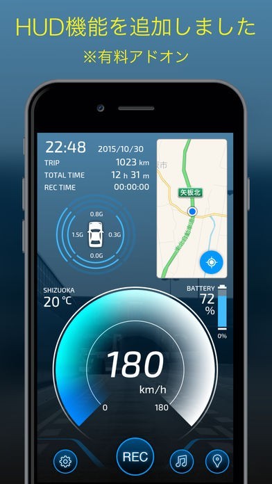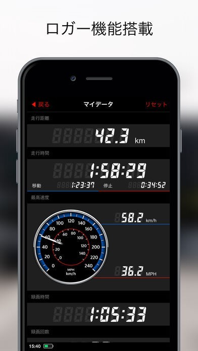 ロガー機能が搭載されており、走行した時間や走行距離などが分かる仕組みになっています。またアプリは縦向きでも横向きでも使用できるようになっているので、使いやすいです。