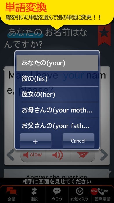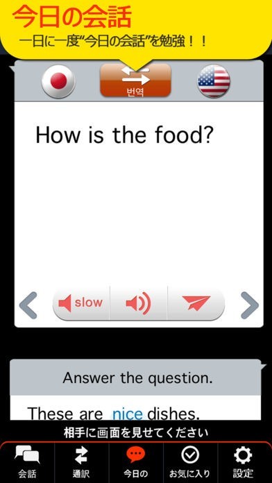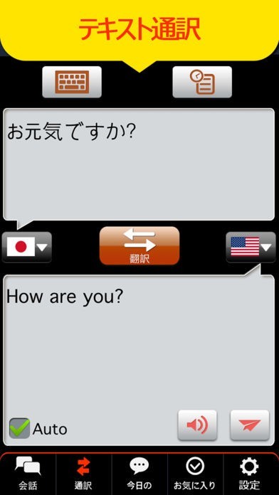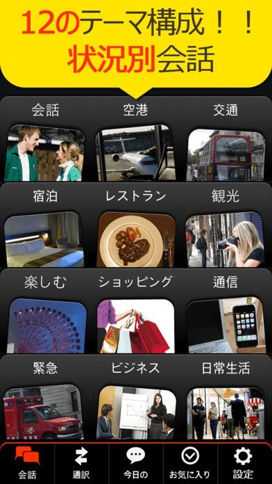 用意されている会話文やテキストの翻訳ができるアプリです。英語やフランス語など10ヶ国語に対応しています。空港やレストランなど12のシチュエーション別に使える会話文が収録されているので、旅行などの際に役立ちます。ネイティブの音声が収録されているので、自分で発音しなくても相手に意志を伝えられて便利です。 文章の単語を別の単語に変えることもできるので、オリジナルの文章にして翻訳することも可能です。よく使うフレーズはお気に入りに登録しておくとすぐに呼び出せます。