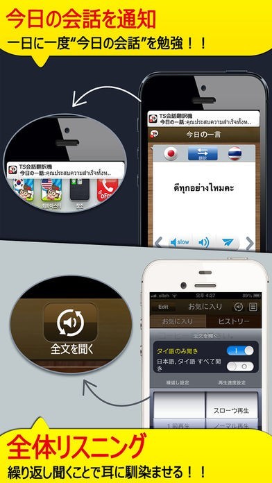 旅行時の会話サポート目的での利用だけでなく、学習アプリとしての利用も視野に入れられています。例文のリスニング学習の他、1日に1度会話を勉強できる「今日の一言」の更新時に通知を受け取れるよう設定するのもおすすめです。