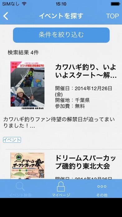 釣りのイベントをスマートフォンから検索、エントリーすることができるアプリとなっていて、開催される場所や日時などからイベントを探して、エントリーすることができるのでスムーズに参加できます。
