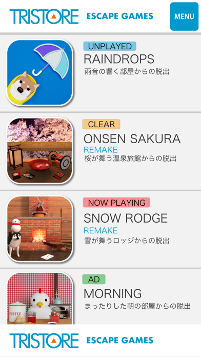 更新型アプリなので、新作や旧作がどんどん追加されます。いろんなテーマの脱出ゲームがあり、雨音の響く部屋や、桜が舞う温泉旅館、雪が舞うロッジなどいろんなシチュエーションを楽しめます。