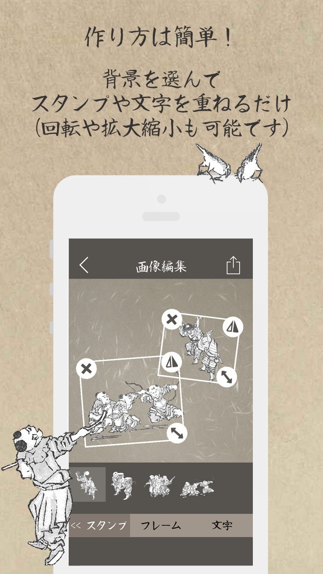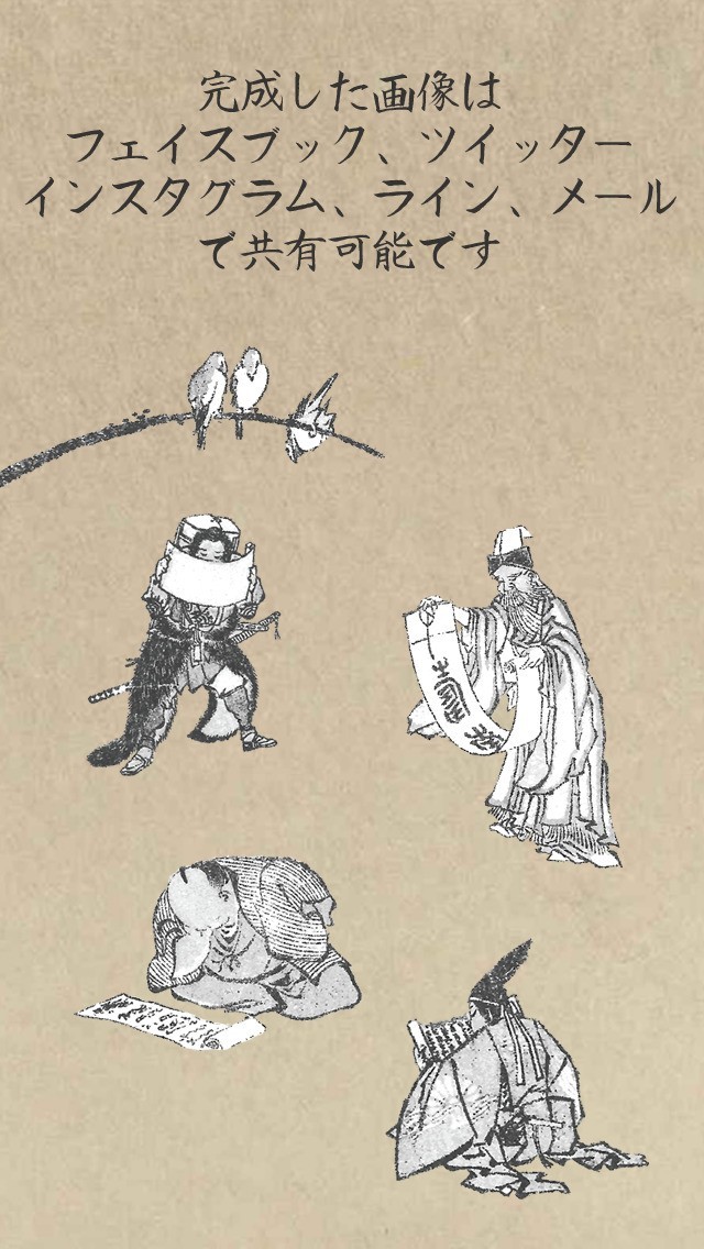 北斎漫画を楽しみたい。川柳や俳句、かるたが好き。 アプリにある北斎漫画を自由に組み合わせて、あなただけのオリジナル漫画を作成することができます。北斎の世界観をアプリで楽しむことができます。組み合わせで利用できるアイテムには、川柳や俳句、かるた、1枚絵、折り紙のデザインを使用することができます。作り方も簡単です!漫画の背景となるデザインを選択後、アイテムを使って編集を加えるだけです。使用するアイテムの回転や拡大縮小も可能です。