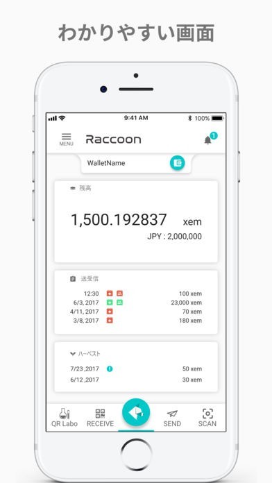 App Storeより引用RaccoonWallet(ラクーンウォレット)は、世界で最も使いやすく安全で、そして楽しいNEMウォレットを目指して、日本のNEM好きのエンジニア・デザイナーが集まって1から作られたウォレットアプリです。