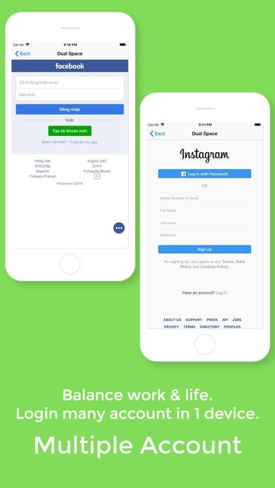 "Dual Space - Multiple Accounts" will help you to login many accounts for many social platforms at the same time, in one device.