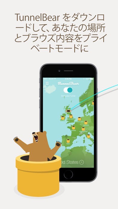 「TunnelBear Free VPN」を使うことによって、プライベートモードであらゆるサイトにアクセスできるようになります。 このアプリは、自分の情報を流出したくないような方に使ってほしいです。 操作面では、オンにするだけで利用することができるので、特にwifiスポットなど危険が多い場所で使うことによって、危険から身を守ることにつながります。 毎月500メガバイトまでは無料で使えるので試してみて、もしも足りないと感じた場合は定期購入するという選択肢も考えられますので、とにかく一度使ってみるのがいいでしょう。
