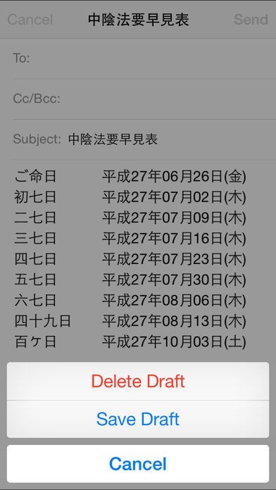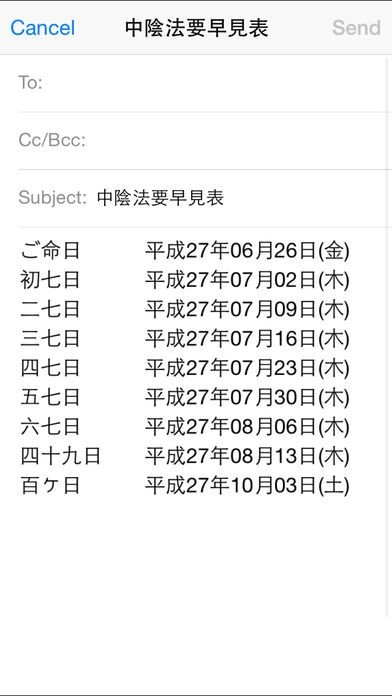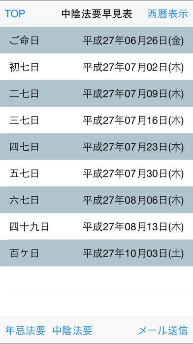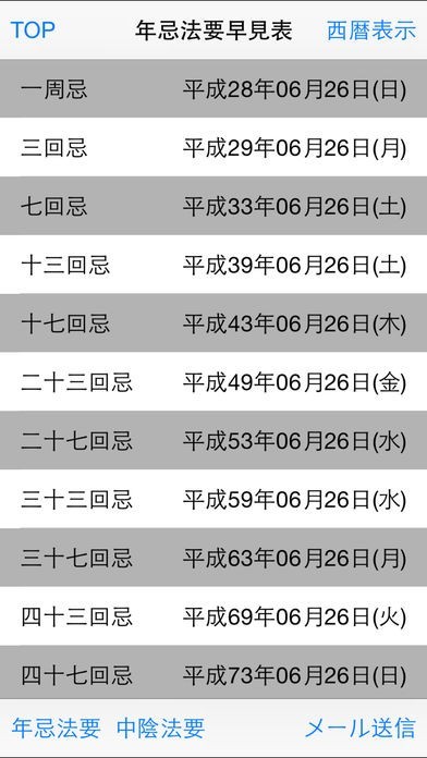 お年忌法要は故人が亡くなってから特定の年数で行われる法要の事ですが一回忌や三回忌などは覚えていられるのですがその他にも十三回忌や二十七回忌など年数が経ってしまうと今年は何年目だったのかを忘れてしまうこともあるのですがそんな時に『お年忌早見表』は役に立てられるアプリです。 個人のご命日を入力するだけでお年忌法要がいつの日になるのかを計算して一回忌から一覧で表示してくれますし、その結果をメールで送信することができるので親族等に送り故人の法事を確認するのに使用できます。 同じようにご命日の後七日毎に訪れる四十九日の中陰法要の日にちも一覧で表示してくれるので忘れ内容にすることができます。
