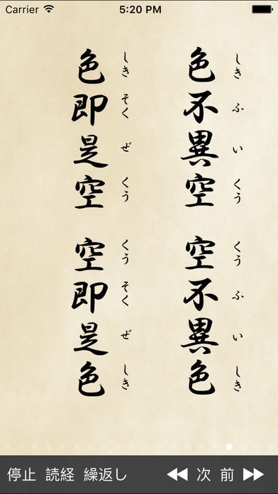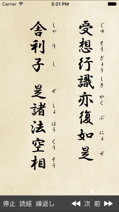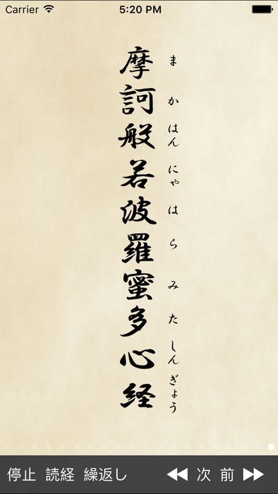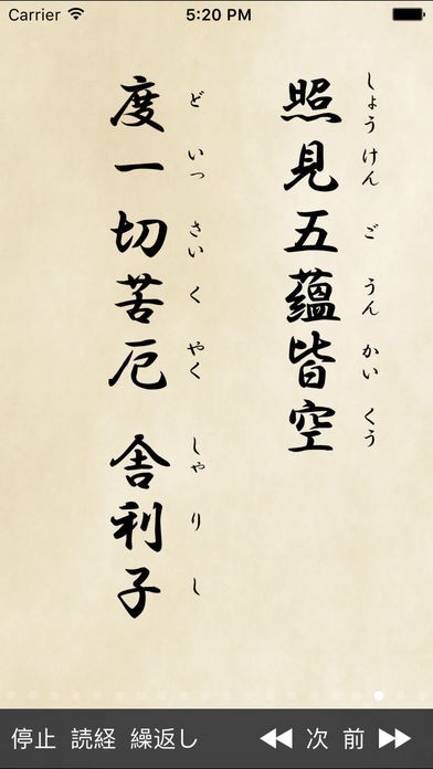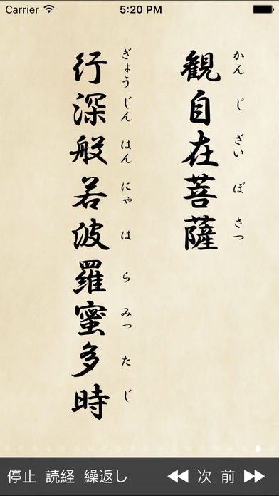 般若心経が表示されるだけではなく、左下の読経ボタンをタップすれば読み上げてくれるので、毎日の読経にとても便利です!正しい発音が学べるだけではなく、般若心経を暗記するのにも使えます!