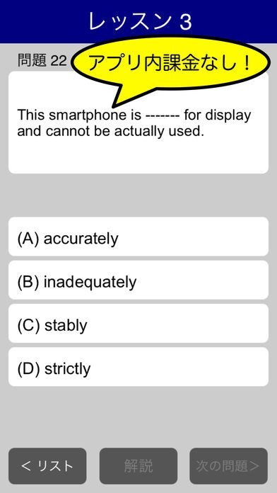 他の英語アプリではカバーされていないことも多い「分詞構文」等の難しい分野もしっかり学習できるようになっています。また文法問題が充実しているのも特徴となっています。