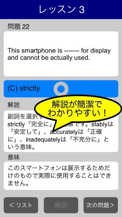 出題範囲は広く、英文法の基礎知識全般が必要なTOEICのパート5ですが、このアプリは過去問題を徹底的に分析してよく出る表現を吟味して作成されているので、対策はこれだけでバッチリです。
