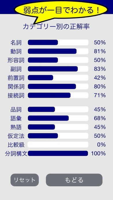 問題に回答していくだけで、語彙、前置詞、仮定法、分詞構文などの正答率が一覧で表示されるので、自分の苦手分野が一目で把握できるので、目標を立てやすく、対策を立てるのに役立ちます。