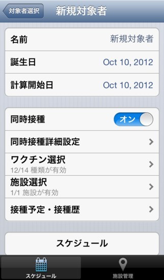 自宅周辺の医療機関を登録しておき、誕生日と同時接種の可否・受けたいワクチンを指定するだけで自動的に推奨するスケジュールを提示します。