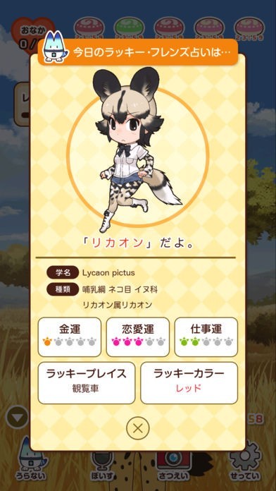 毎日自分の運勢を占うことができるラッキーフレンズ占いにはサーバル以外にも色々なフレンズが登場するので、占いの結果に一喜一憂すると共にフレンズとの出会いを楽しめます