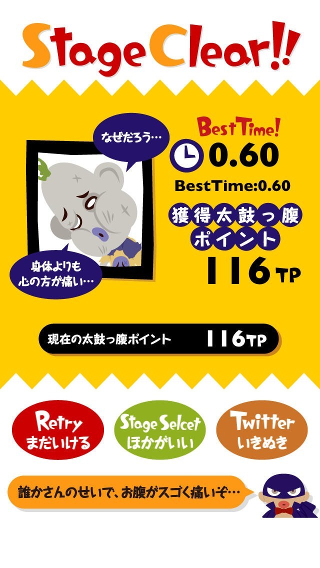 「タイコッパラマン」は、敵に紙くずをぶつけて倒すお手軽シューティングゲームです。画面の中を歩き回る敵をタップして撃退していきましょう。大量の敵が出現するため、タイミングよくタップを続けることがハイスコアへの鍵となります。ゲーム後にはクリアタイムも表示。ベストタイムを目指して腕前を磨いてみてはいかがでしょうか。コレクション機能が用意されており、ステージで「TP」を貯めることによって新たなキャラクターをコレクション登録可能。コンプリートを目指してじっくりやり込むこともできます。1ステージあたり数分程度で終了するため、電車の待ち時間の暇つぶしとしても活躍してくれるゲームとなっています。