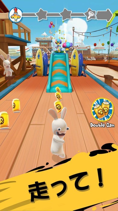 「Rabbids Crazy Rush」はハチャメチャに設定されているコースをラビッツたちを操って走破していく爽快ランアクションゲームアプリです。障害物を避けながら気球に注入するためのエネルギー缶を手に入れることが基本的な目的となっていますが、特定の目的を撃ち落としたりラビッツを壁にぶつけたりといったランダムミッションも多数用意されています。忍者やバイカーなど多彩なコスチュームを手に入れて、ラビッツを着せ替えてあげることでさまざまな特殊能力を発動させることが出来るようになっているのでステージをクリアするために最適なコスチュームを考えることが大事になっています。