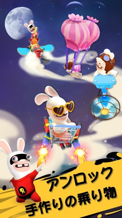 さまざまな乗り物を乗り換えながら最終目的地点のお月様を目指すランアクションゲームアプリが「Rabbids Crazy Rush」です。ちょっとおバカなラビッツを操作することができるようになっていて、手作りで飛行機やグライダーなどさまざまな乗り物を作るだめにステージに落ちているアイテムをゲットしてアンロックしたり、ランダムで発生するミッションをクリアしたりすることができるなど、豊富な要素が盛り込まれているゲームになります。