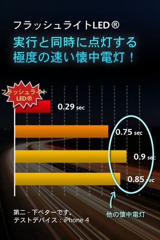 単に画面を白色で明るくする他のアプリケーションとは異なり、"フラッシュライトLED ®" は、LEDフラッシュを使用しているので、今までのものに比べて10倍以上明るいです。