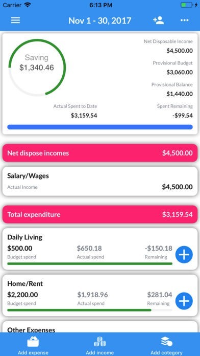 1人から複数人で運用することができる家計簿です。グラフィカルなデザインが分かりやすく、簡単に家計をチェックすることができます。円グラフや棒グラフが多用されていて把握しやすい設計です。
