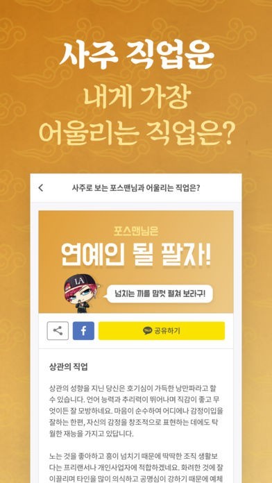 - 나의 성향, 애정운, 재물운, 명예운, 직장/학업운, 꿈 해몽 등 테마별 운세