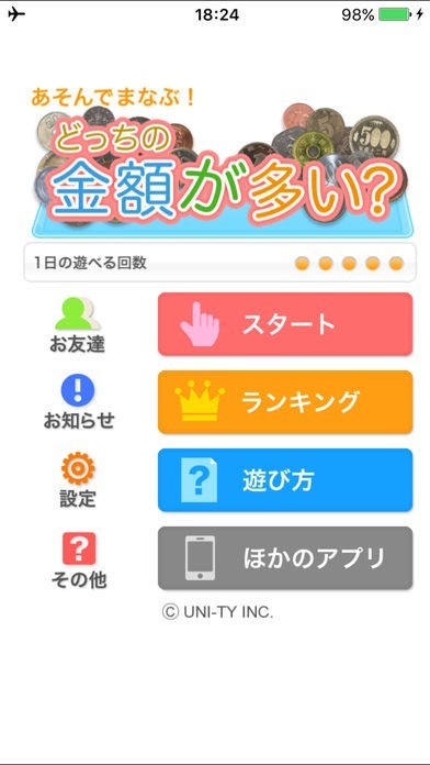 どっちの金額が多い?(あそんでまなぶ!シリーズ)は画面の左右に表示された1円から500円の複数の硬貨から、どちらの合計金額が大きいかを素早く判断していくアプリです。隙間時間にプレイできるシンプルなルールで、計10問が主題され、合計金額が大きいほうを制限時間内に指でタップし、ユーザー同士でスコアやタイムを競うこともできます。ランキング機能が充実し、アプリユーザーで競うワールドランキング、友達同士のお友達ランキング、自分の記録の限界に挑む自分ランキングを搭載しています。100点を目指してソロプレイや友達、親子でクリアタイムを競って楽しむことも可能です。