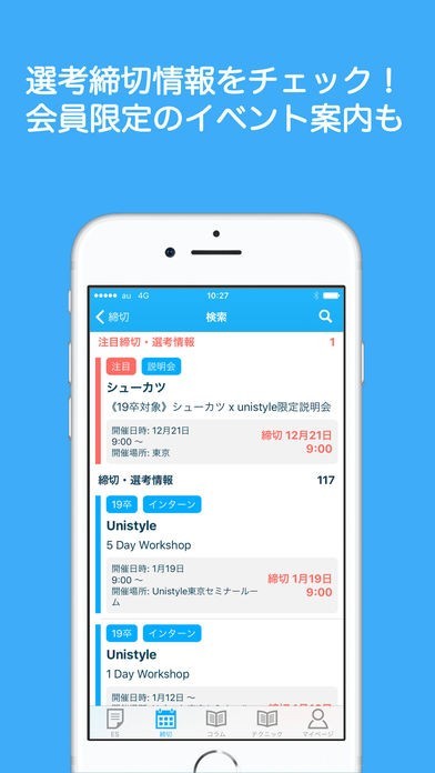 人気企業のES選考・締め切り情報を簡単にチェックできます。締め切りの日時が赤文字で表示されているので見逃しも防げます。また会員限定のイベントや非公開求人の案内も受け取れる特典もついています。他の就活生にはできない独自の就活がアプリ一つで手軽にでます。