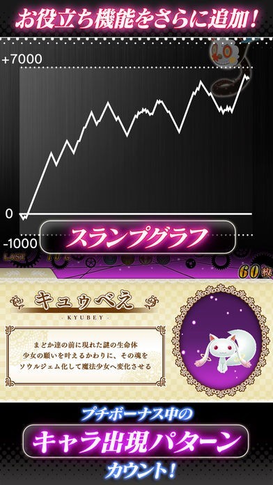 SLOT魔法少女まどかマギカ2はパチスロの同名機種を忠実に再現したシミュレーションアプリで、BGMやアニメーション演出などがすべて楽しめることが大きな特徴です。また、確率のデータを見ることも可能なので実機を楽しむ方にも有効なアプリです。なお、ユニバ王国の対象アプリのためイベント参加やメダル増加アイテムを使用することができます。