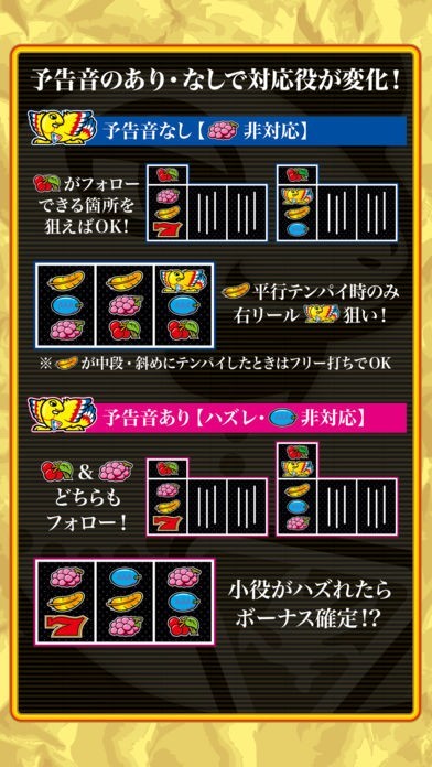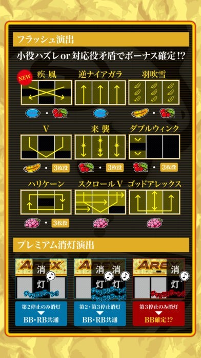 本アプリケーションには初心者の方でも簡単にプレイを始められるようにスロットの基本的なルールの一覧表示が可能となっています。また、一覧を表示させながらプレイすることも可能です。