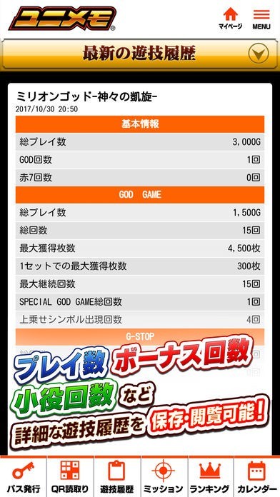 ユニバーサルエンターテインメントの遊技機のプレイログが残せて、ランキングも表示されるので便利です。