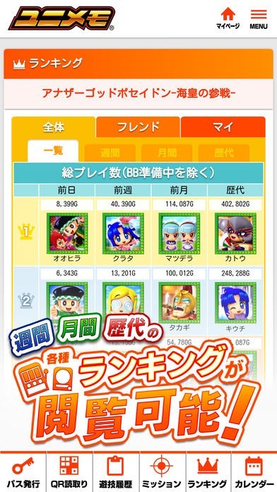 ユニメモを利用すれば機種ごとに用意されたミッションを楽しむことが出来ます。ミッションには星1つから星5つまでの難易度があり、ミッション達成率上位になればランキングにのることができます。