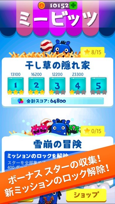 「もぐらたたき風タップゲーム「ミービッツ」」はもぐらたたきのように、アプリキャラであるミービッツくんが持っているお菓子やコインをを叩いて取っていくゲームです。集めたコインは、強化アイテムの購入にあてることができるのでどんどん集めていくことが大切です。また、コンボを成立させるとボーナスポイントを獲得することもできるので積極的にコンボさせていきましょう。新しいステージに進むためには、ボーナススターを取っていくことが重要になってきます。とにかくスピーディーにミービッツくんを叩いていくことが大事なので、通勤通学の電車時間などにクリアしていきましょう。
