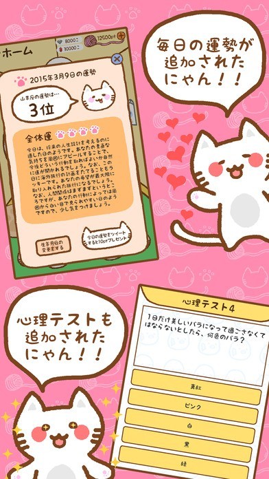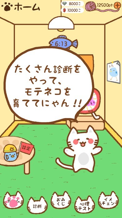 モテネコ育成機能があり、100種類以上の診断チェックで、たくさん診断をすると育成していく
