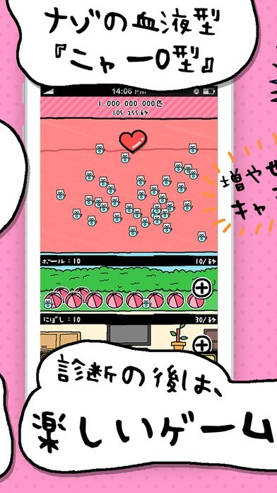 48万ダウンロードを達成した「O型診断 性格テストxネコ1兆匹」のターゲットはずばりO型の方で、その方のみが自分の性格を診断することができ、他の血液型の方は同じアプリが別にあるので、そちらを利用するといいでしょう。 使い方としては、20問の3択問題に答えるだけなので、苦もなく回答することができ、誰でも簡単にできます。 そして結果が表示されるので、当たっているかをお友達に聞いてみたりして交流するということもできます。 それ以外にもゲームもできて、「ニャーO型」をたくさん生産していくゆるいゲームを楽しむことができるので、暇つぶしに役立てることができますし、どんどんと増えていくと達成感を感じることができる一石二鳥のアプリです。