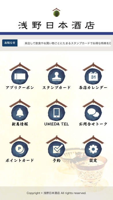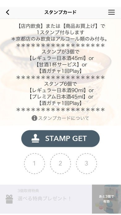 スマートフォンを浅野日本酒店のスタンプカードとして利用することができるアプリとなっていて、来店することでスタンプを貯めることが可能で、貯めたスタンプを特典と交換できます。