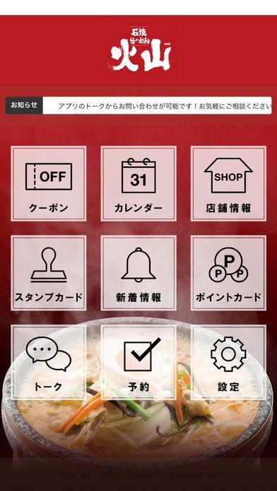 石焼らーめん火山は同名のラーメン店の公式アプリで、店舗に行くと貯まるスタンプカード機能やクーポンの配信などに加え、ラーメンの限定メニューの情報配信なども用意されています。
