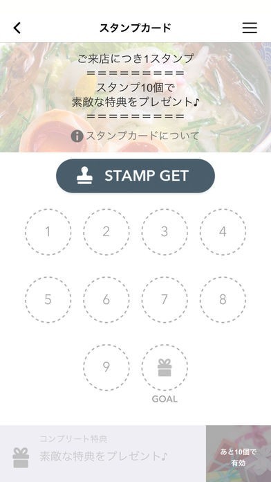 1回の来店につきスタンプカードに1つスタンプがもらえます。スタンプカードが全部貯まると豪華な特典を受け取ることができるので、ポイントと合わせて貯めていくのがオススメです。